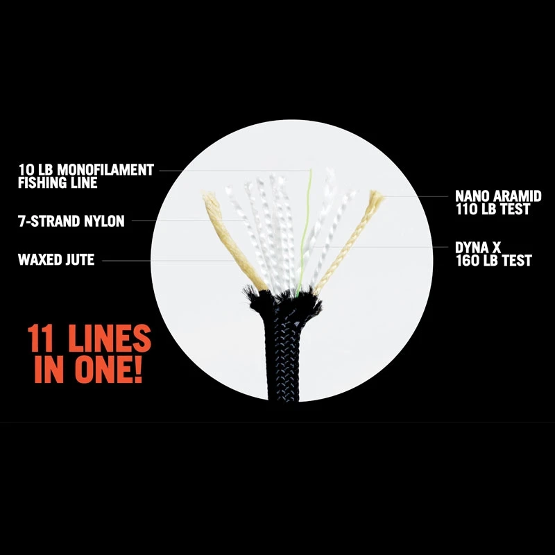 With the Atwoood Parapocalypse Paracord, not only do you get all the benefits of paracord, you also get high-end practical survival tools. With a waxed-jute strand, you can easily start fires with little effort. Use the 4.5kg (10lb) breaking strain fishing line to catch your dinner. Use the 480°C (900°F) heat-resistant cord for campfire rotisserie cooking, friction saws, or suspending a hot broken exhaust. Lastly, you have the almighty Dyna X cord with super strength, ultra low-stretch and perfect for emergency sutures.