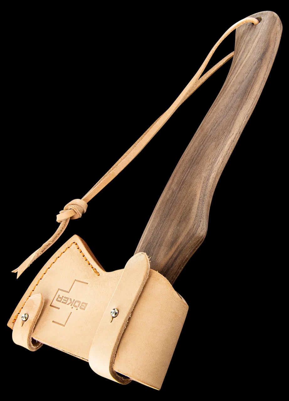 In keeping with the noble head material, the handle is made of high-quality and decorative walnut wood. An included leather sheath made of natural-coloured light cowhide and carefully sewn piping reliably protects the cutting edge. Two leather handles hold the axe securely in position. A double-riveted strap on the back of the sheath allows the axe to be hung or attached to a rucksack for transport.