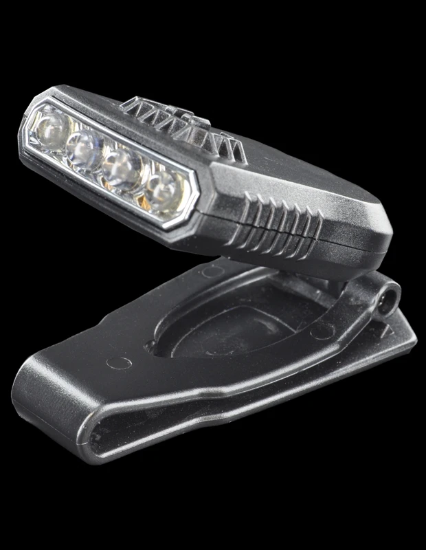 Simple and effective white/green LED light that clips onto the bill of your hat and can be angled up and down.
