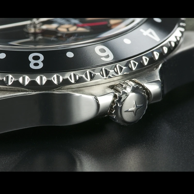 This timepiece is a tribute to the early times of professional diving watches with many historical references: the egg-shaped 10 ATM water resistant case, the typically curved crystal, printed Super-LumiNova indices and a bezel inlay made of aluminum.