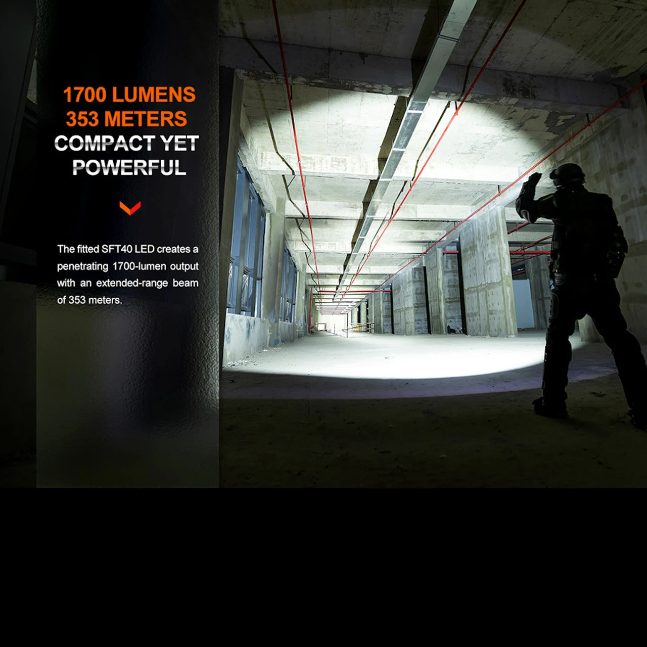 - Turbo: 1700 lumens (2 hrs 15 min inc temperature and battery level step downs) – 353m beam