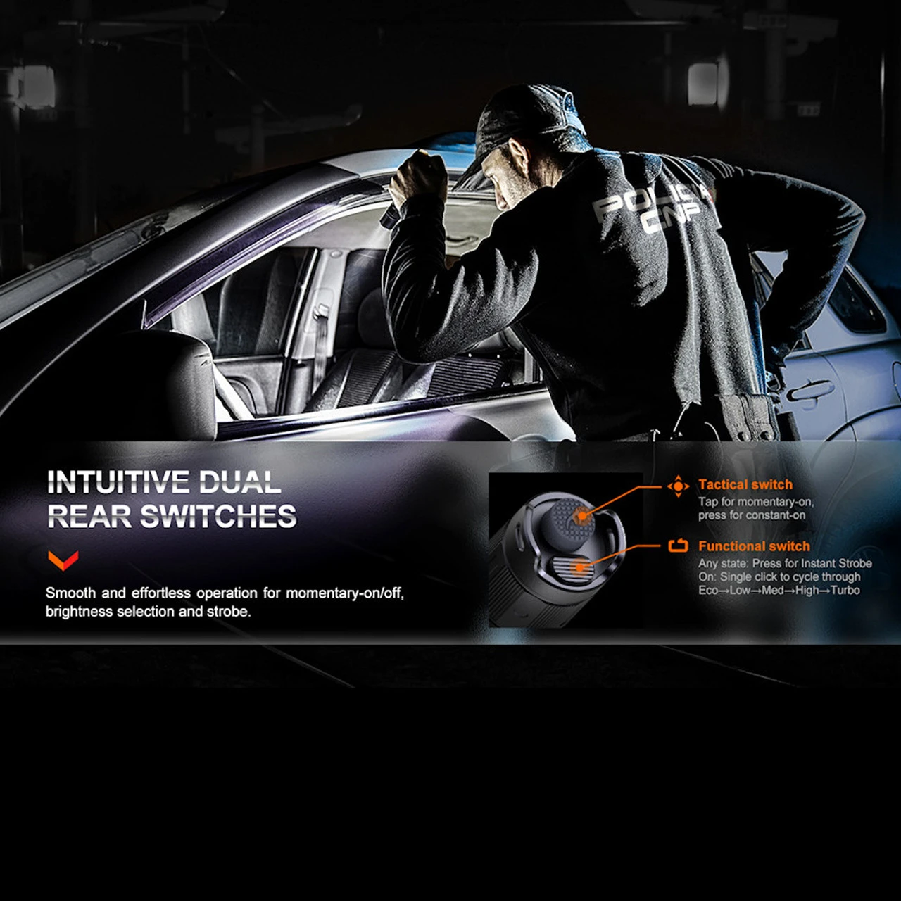 The dual switch tail cap controls all functions and gives fast access to the blistering 1700 lumen Emergency Strobe output whether the light is switched on or off. A large power button operates momentary and constant-on lighting whilst the smaller mode button changes brightness levels and operates strobe output