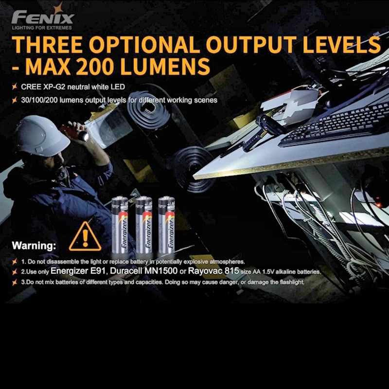 The Fenix WF11E is an intrinsically safe Fenix torch designed for use in potentially explosive gas and dust atmospheres and built to the usual Fenix premium quality. WF11E uses 3 x AA alkaline batteries (supplied) and features 3 brightness levels of 30, 100 and 200 lumens. Powerful magnets inlet into the tail and body clip allow for useful positioning in the work area whilst the RTP 399X133887 explosion proof / anti static body is drop tested to 1.5 meters and submersible to 1 meter for the toughest jobs.