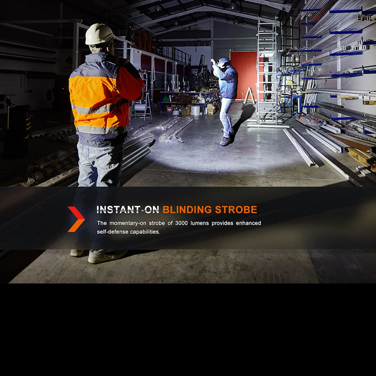 Dual tail cap switches provide convenient one hand operation of all lighting functions including 3000 lumens Instant – Strobe for self protection.