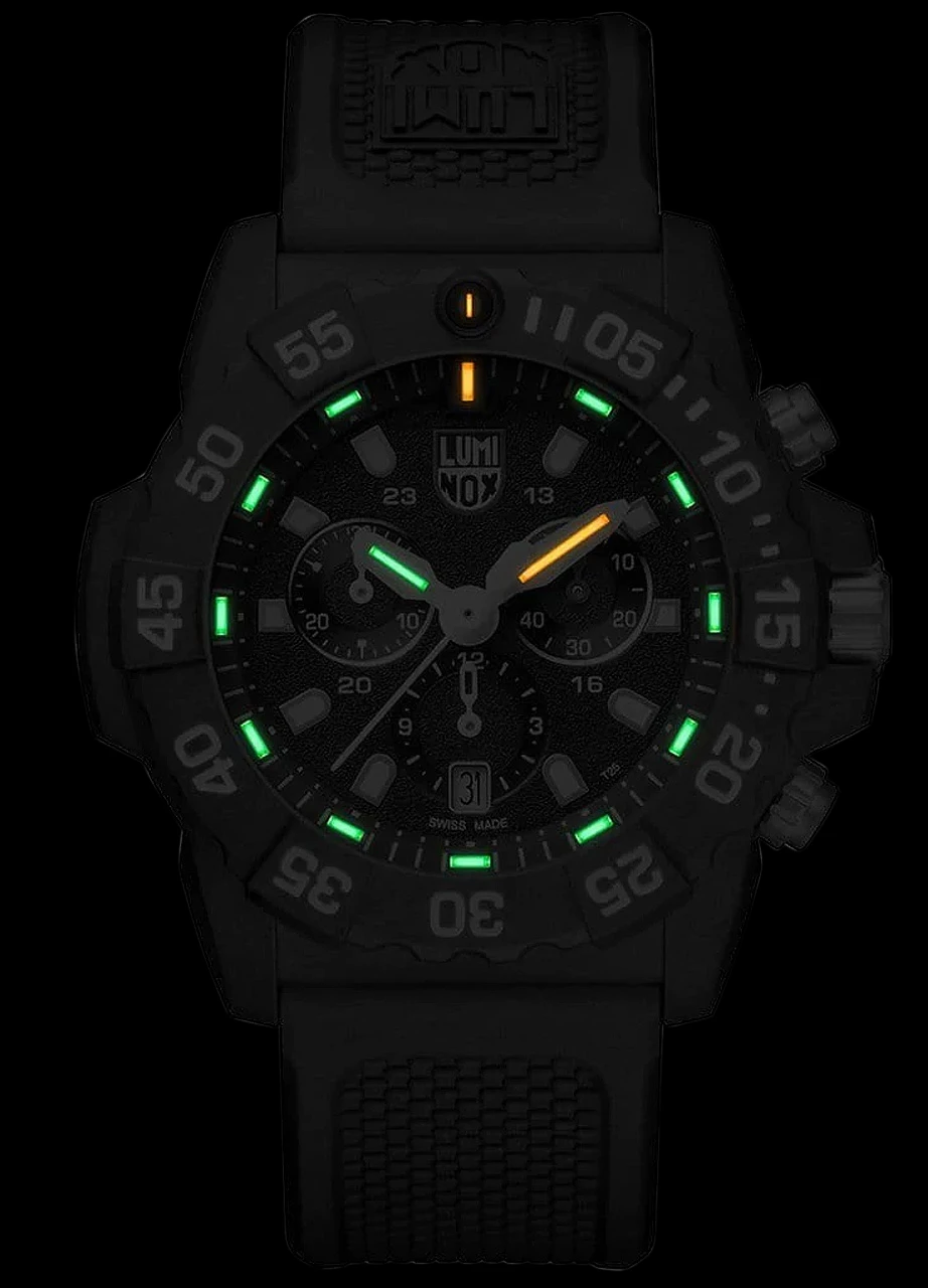 The Luminox Light Technology (LLT) ensures that all its watches have easy and immediate readability, and are Always Visible constantly glowing for up to 25 years. The Luminox Navy Seal Chronograph 3581 is a quality time piece with an impressive look and precise Swiss, quartz movement.