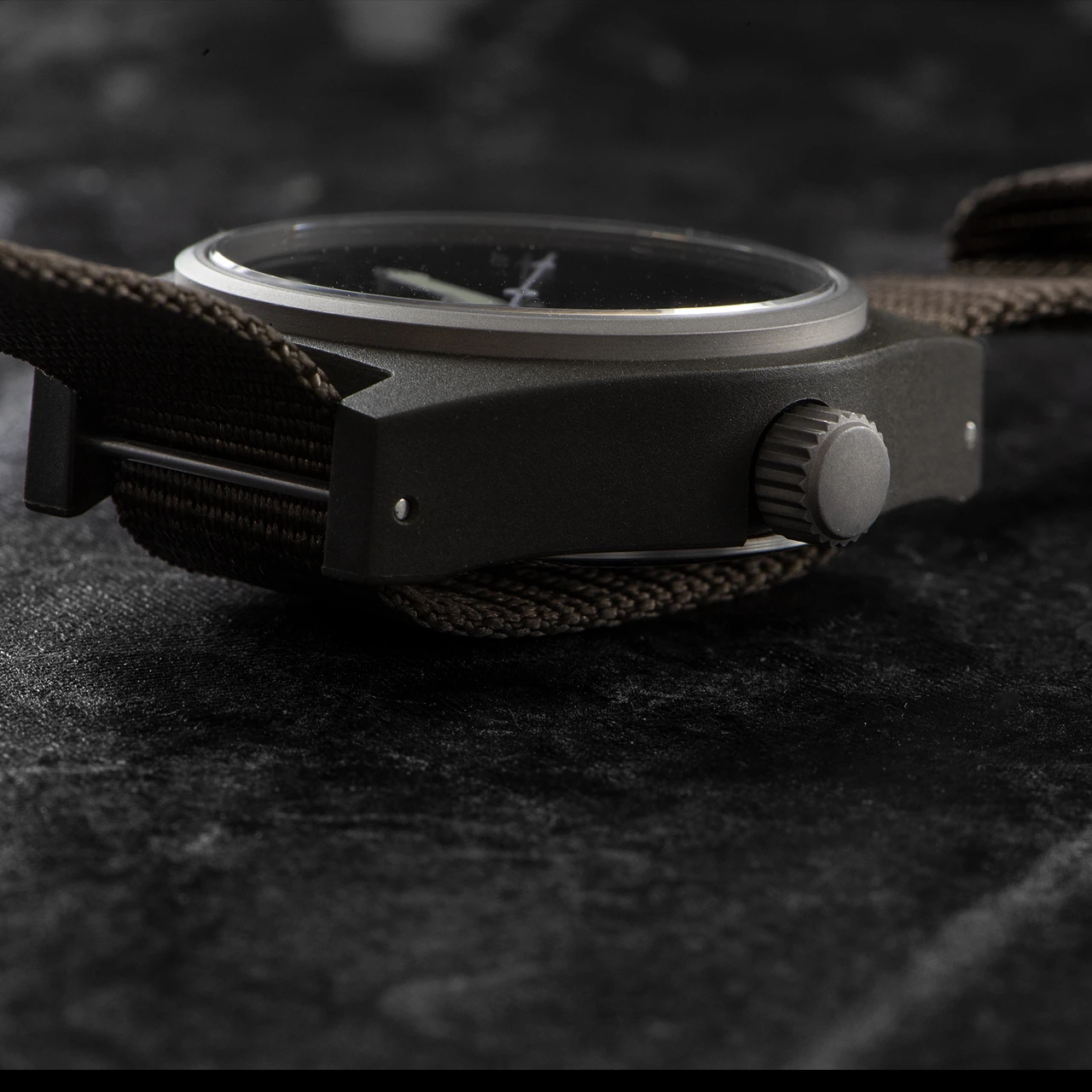 The General Purpose Quartz uses non-tritium Maraglo luminous markings when, exposed to a light source will glow in the dark. This version is the Sage Green “No Government Markings” (NGM) edition and has no date window.