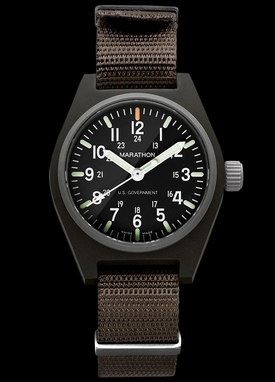 The Marathon General Purpose Quartz with Maraglo is a highly accurate watch built to strict military standards (MIL-PRF-46374G, Type I, Class 1). Designed for field use by military personnel, the General Purpose Quartz is built to withstand the needs of infantry, as well as suit civilians’ needs for a casual watch.