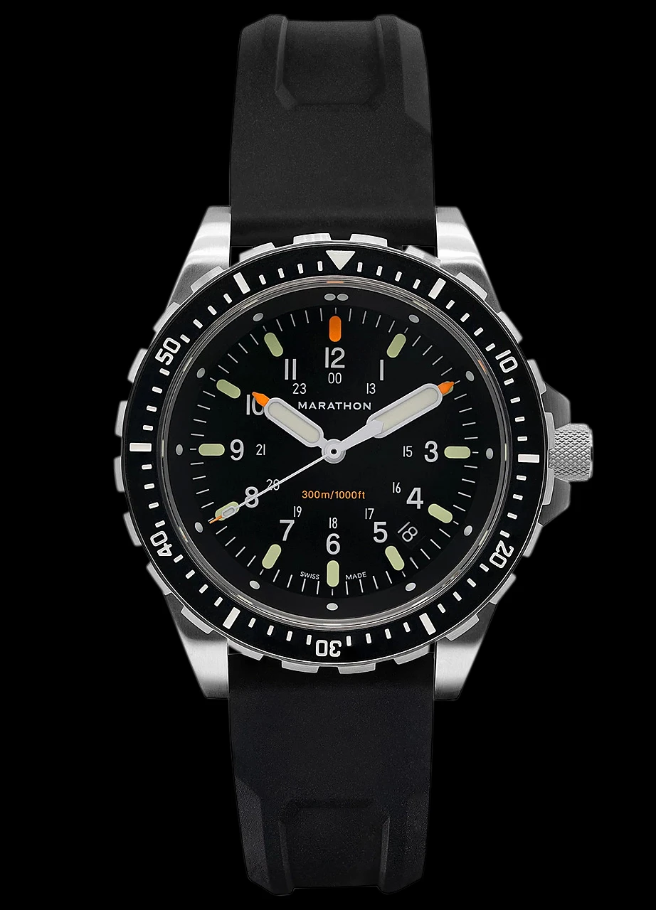 The Marathon JSAR is water resistant down to 30 ATM – 300 meters (1000 feet) underwater. Made from 316L surgical grade stainless steel, the JSAR is a hefty, purpose built watch that will not let you down. The glass of the JSAR is in fact not glass, but a synthetic sapphire which will resist scratches, and is coated in an anti reflective coating to ensure maximum dial legibility.