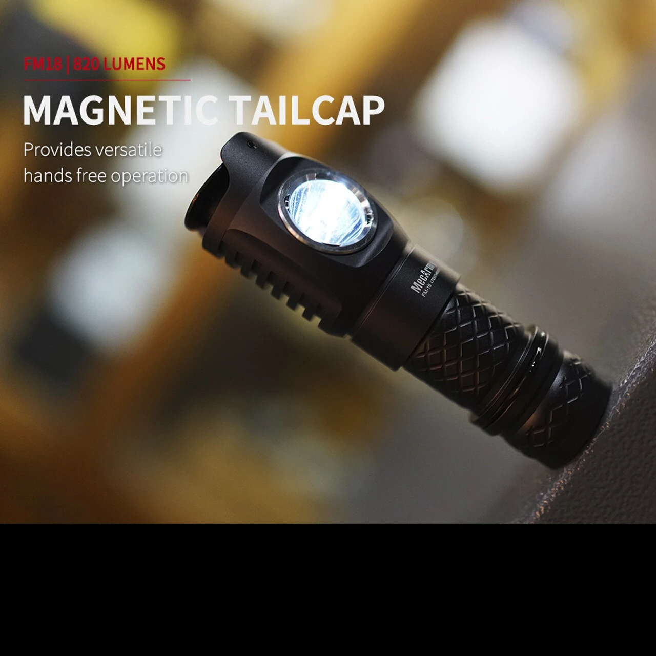 The Mecarmy FM series lights are equipped with CREE XPL-HI LEDs delivering high lumen levels and constructed from aero grade HAIII aluminium alloy. The MecArmy FM18 blasts out 820 lumens in a standing out the front design. It features a pocket clip and magnetic tail cap making carry and work easier and more convenient. Charging is easy on the go, thanks to the built-in standard Micro USB charging port with only a cable on any USB power devices. FM18 is powered by 18650 Li-ion battery.