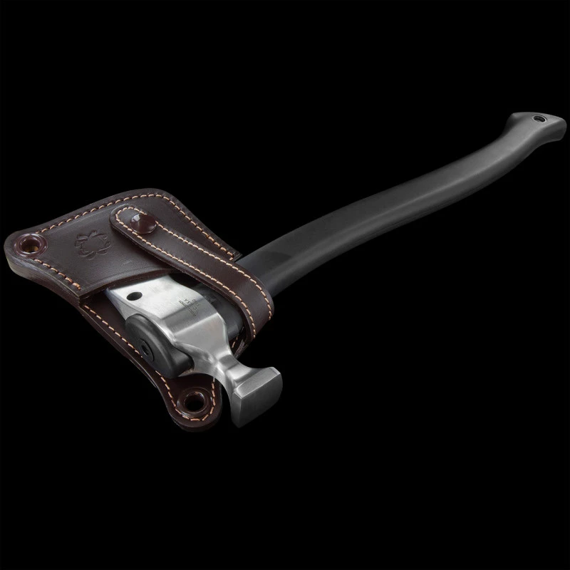 When not in use, the HatchetHawk and its owner are protected by a handcrafted heavy leather sheath with a snap-fastened leather strap. A loop on the back of the sheath allows convenient belt carry, while grommets in the sheath body will accept a cord or strap for over-the-shoulder carry like a classic baldric.