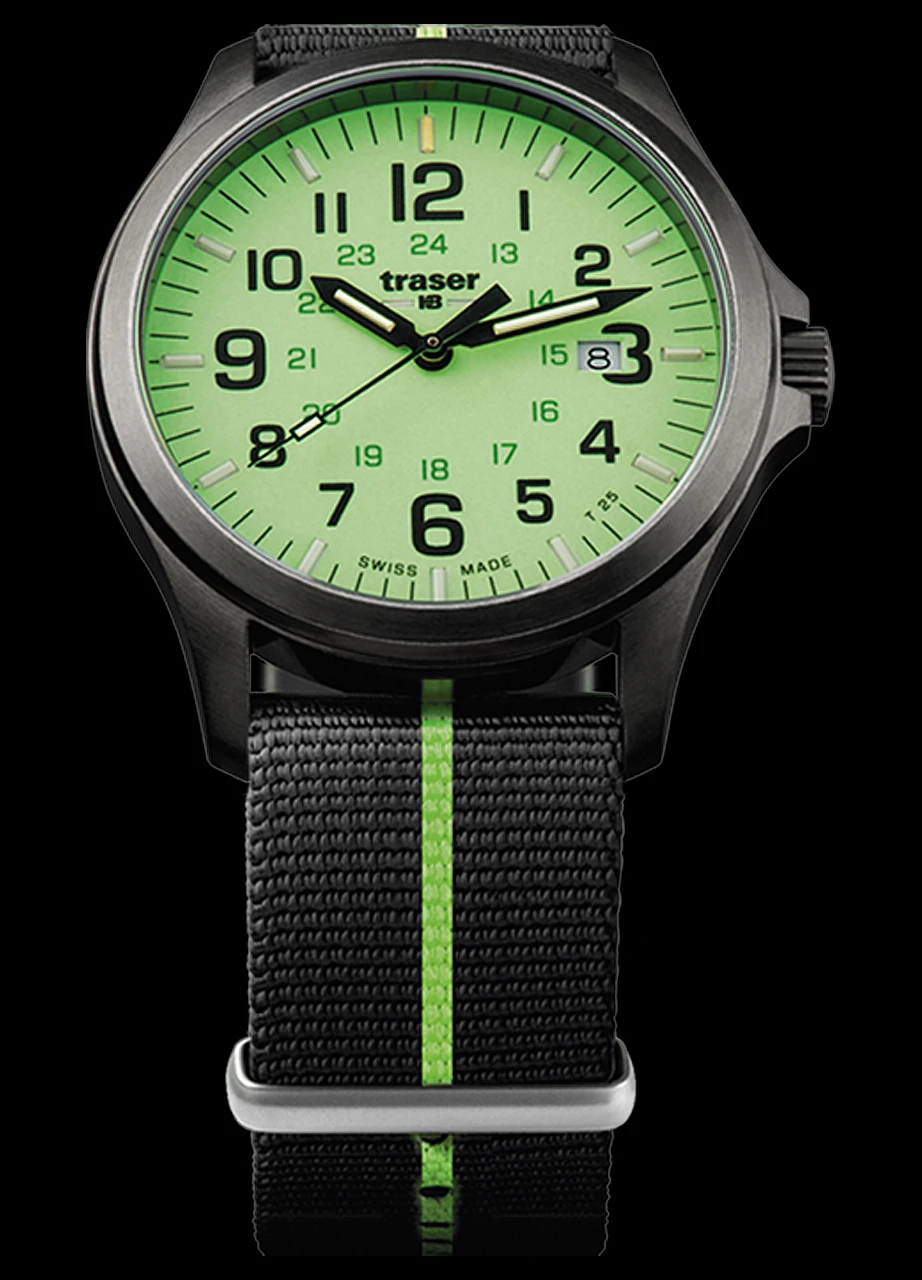 Traser H3 P67 watches belong to a long history of functional, reliable and stylish military watches. For clarity, time keeping and no fuss aesthetics there are non better. The Traser H3 P67 Officer Pro GunMetal features a gun metal stainless casing and Tritium vials to illuminate the time points. The watch faces feature Super-LumiNova which make the entire face glow after exposure to light. There is a choice of either ornage or lime green, both with a NATO strap.